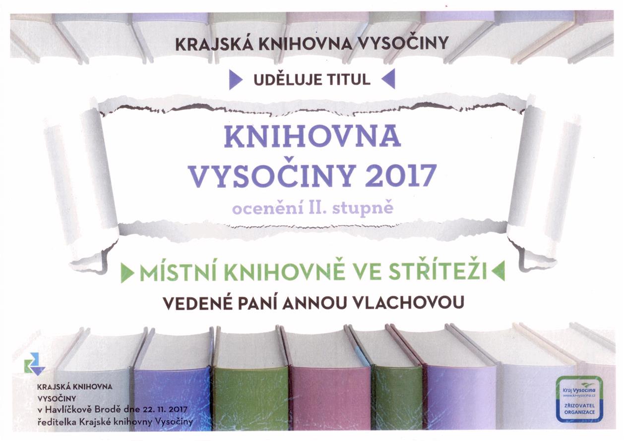 Místní knihovna ve Stříteži získala titul Knihovna Vysočiny roku 2017, ocenění II. stupně. Knihovnu od roku 2010 vede paní Anna Vlachová.