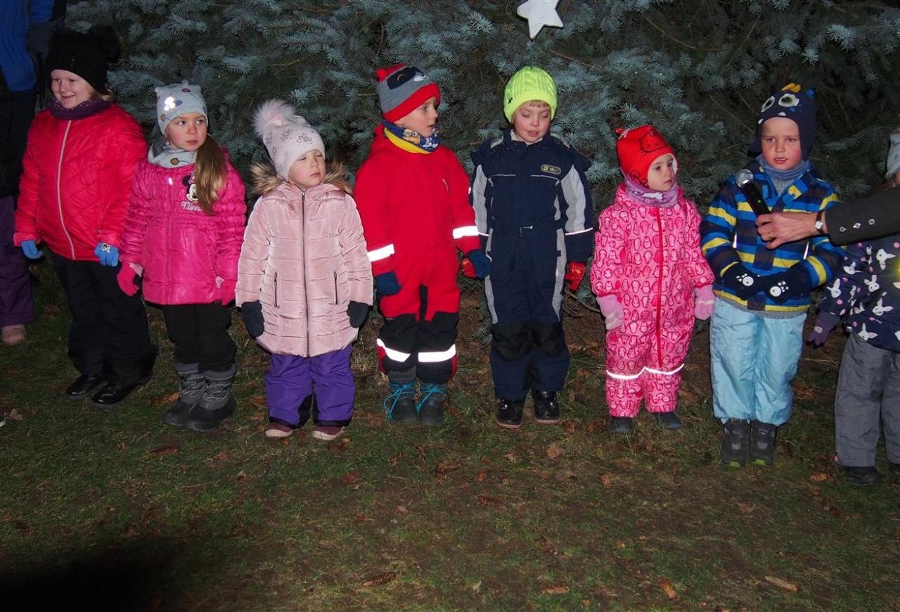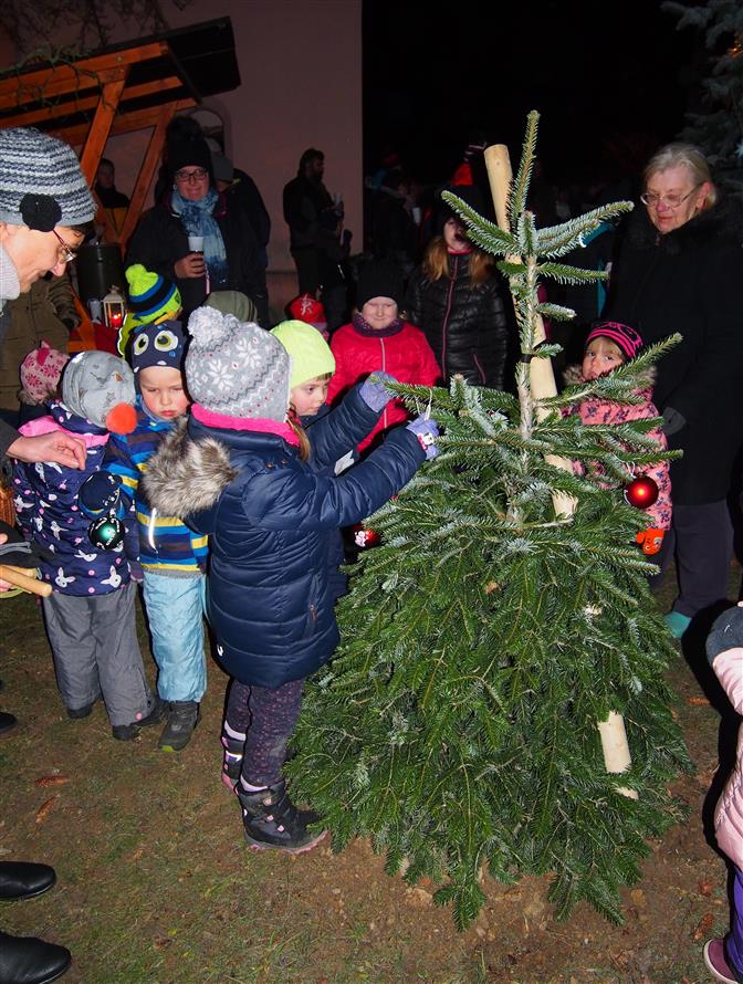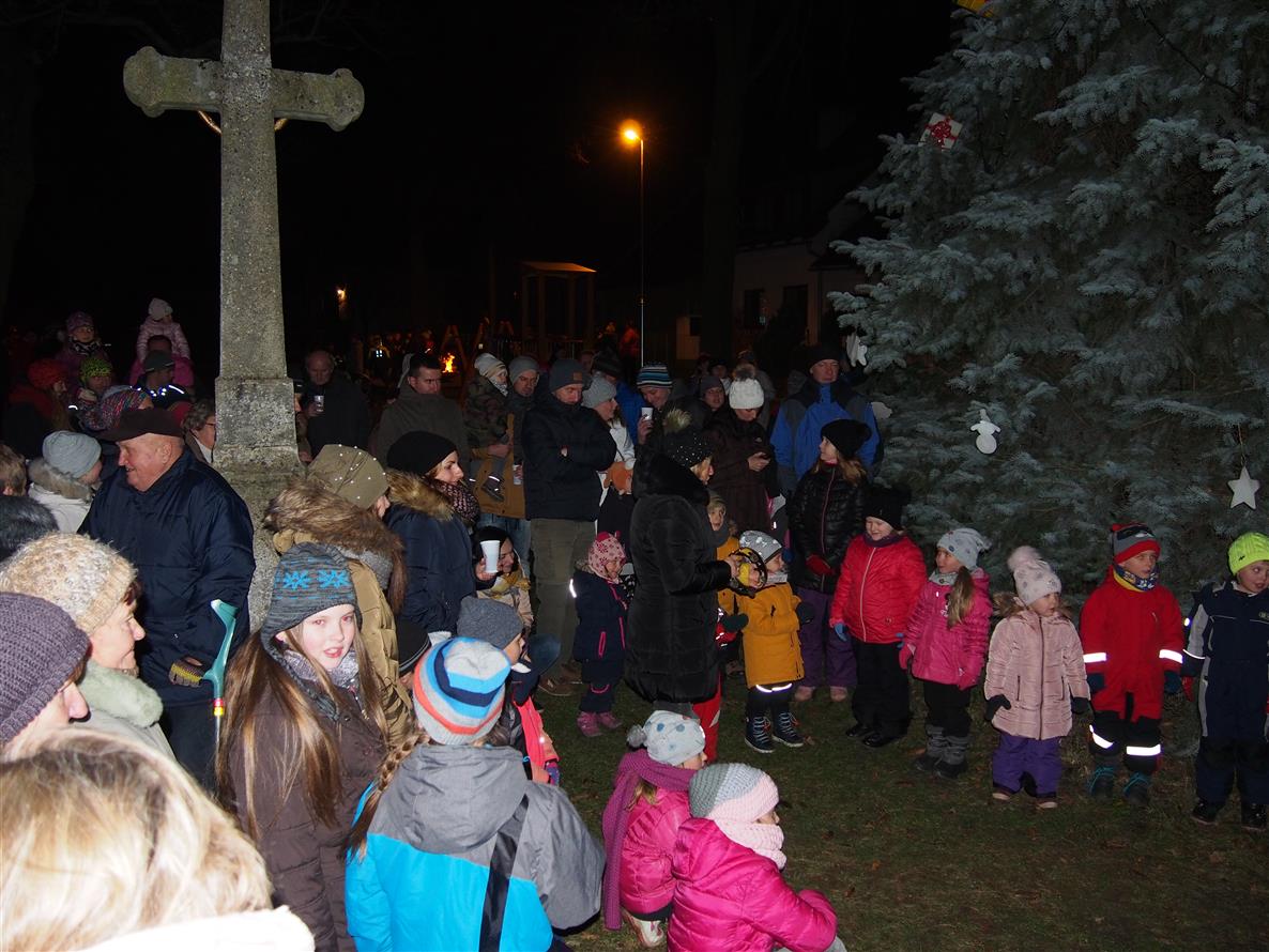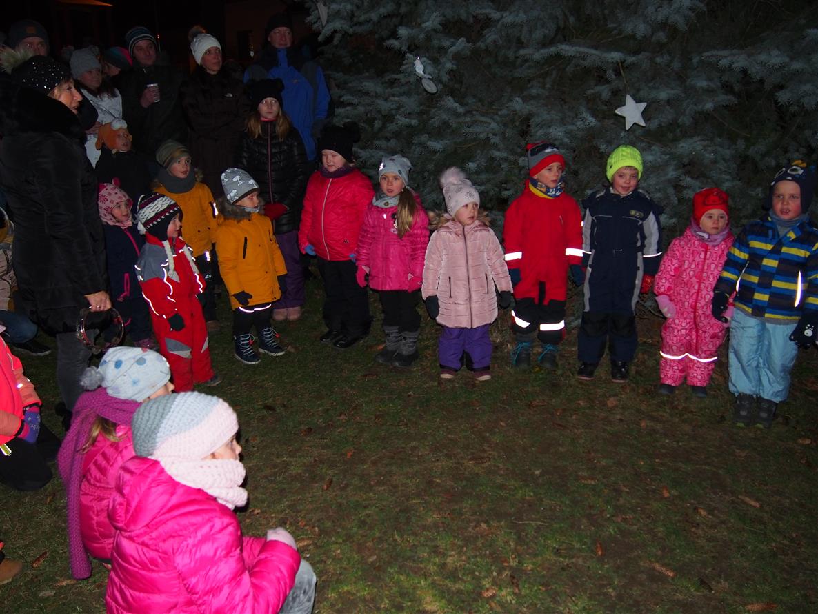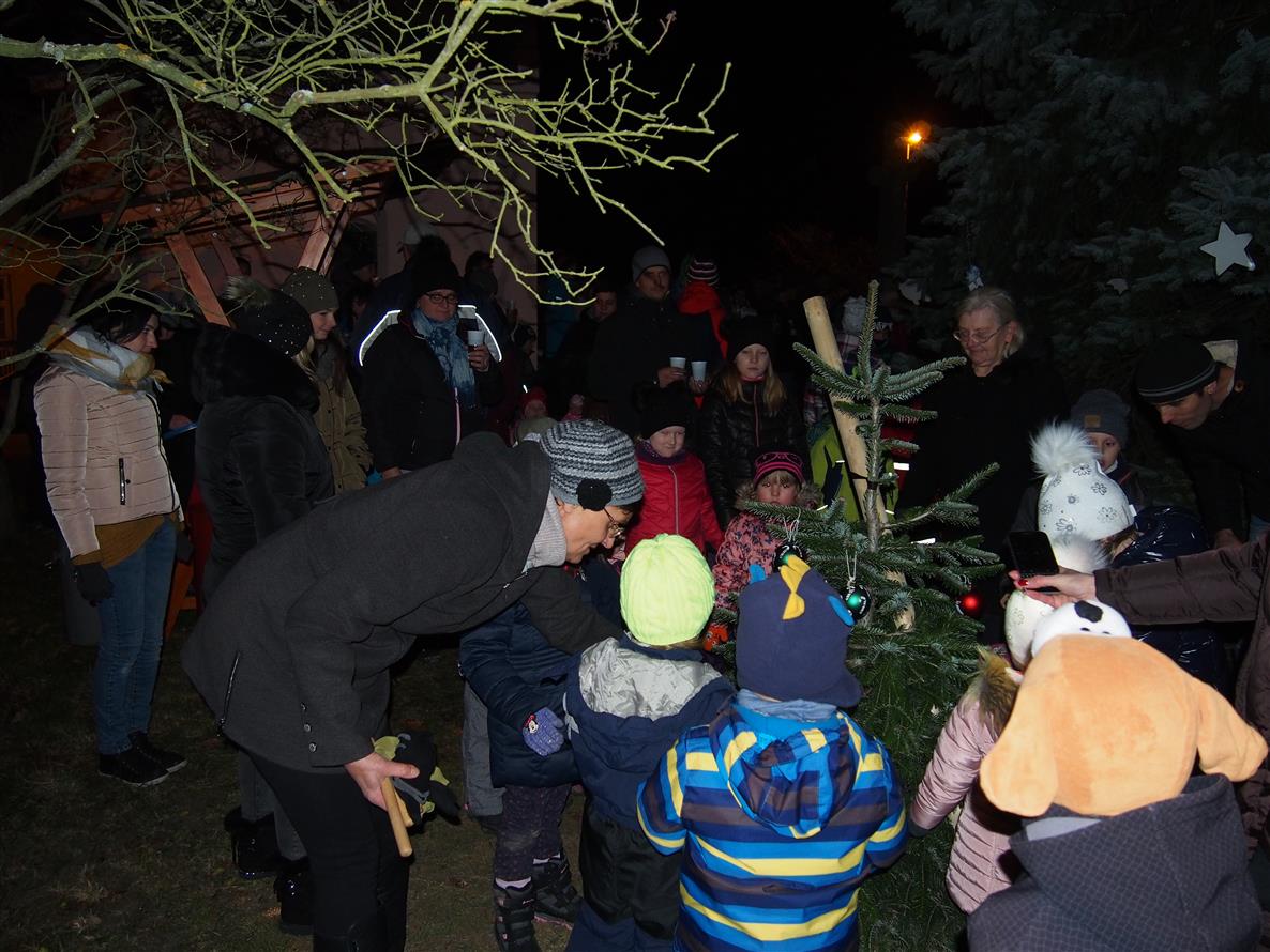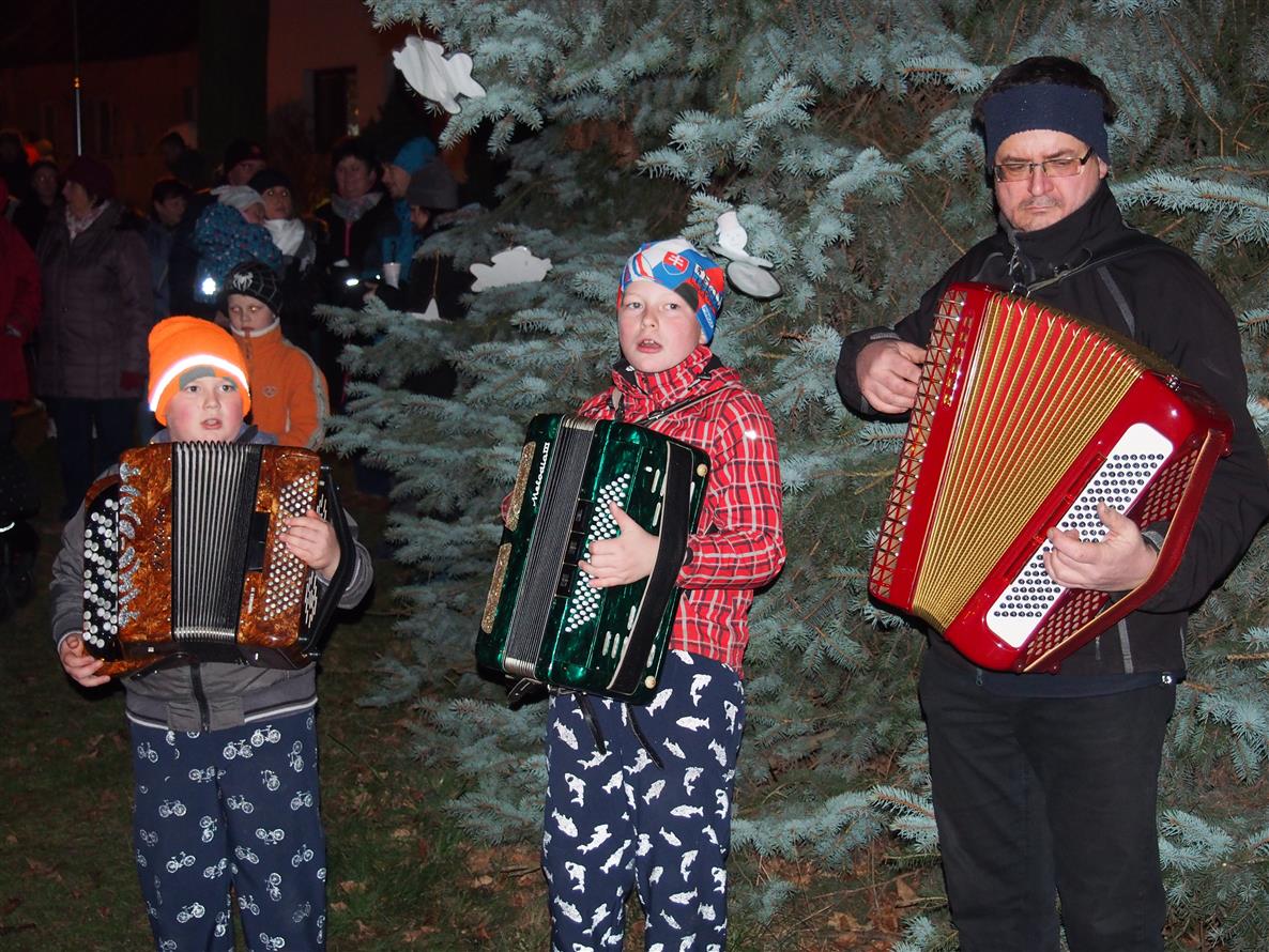 Děti ze školky poprvé ozdobily letos vysazený budoucí vánoční strom. Otec a synové Dvořákovi společně zahráli na harmoniky koledy a vánoční písně. A byl rozsvícen vánoční strom.